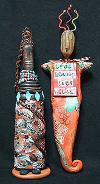 The first day we created our “Messengers and Storytellers”. I named my first creation “Queen Goldie”. She is a proud and regal queen who symbolizes the strength and courage of a woman. She wears a formal robe richly patterned with polymer clay canework, a bead and copper coil necklace and a gold crown atop her brown and black chenille and copper metallic yarn hairtwist. Very formal queenly attire which she wears with dignity and grace. However, if you look closely, you can see a hint of her playful side – a gold toe ring that she is wearing on her left foot – a reminder of the importance of making time for “play” amidst the responsibilities of our daily lives. She is free standing on top of a gold platform.