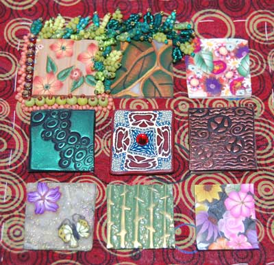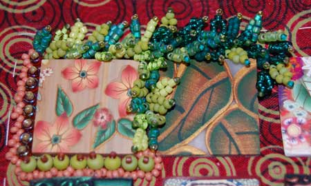 When I glued the polymer clay tiles to the fabric for my August page, I really didn’t have any plans for the beading beyond choosing a color palette. I knew that I wanted to bead around the tiles but not surround each tile as if they were cabochons.