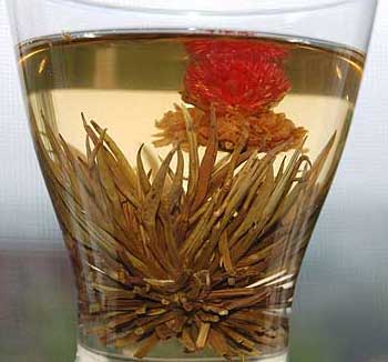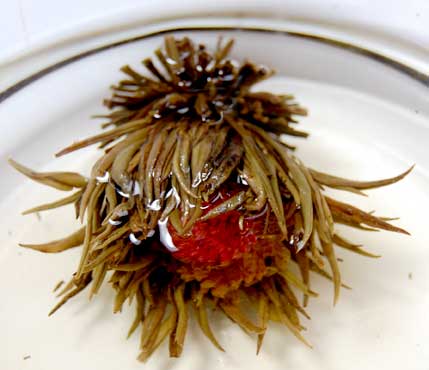 Did you guess what the little “tea kernel’ from yesterday’s post is? Here it is, opening up to reveal its hidden treasure. Meet Jasmine Blossom tea, a specialty hand-tied display tea from China. The leaves are plucked and processed as green tea. Then a bunch of leaves are tied together around a beautiful pink flower which is revealed once the tea is steeped in hot water.