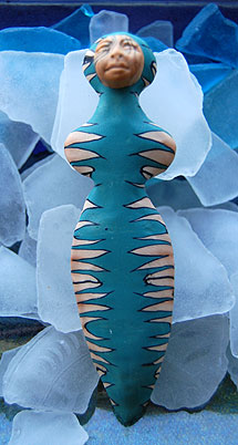 Last Saturday at my polymer clay guild meeting, I created a little goddess for my Mom’s birthday. I used the spliced cane technique for her body and a mold for her face. She seems to be gazing heavenward doing some deep thinking, doesn’t she?