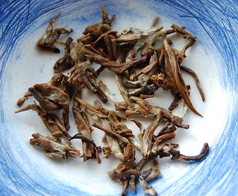 This morning’s tea comes from an ancient tea forest located in the misty Jing Mai mountain area in southwestern Yunnan province of China. The hill tribe people of this area, originally called the “Pu”, have been cultivating tea in this forest for over a thousand years. The history of their sacred tradition is documented in ancient stone relics and scrolls. This tea, harvested from a varietal of the tea plant called Camellia Sinensis Assamica, a broad leafed tree, is called Ancient Organic Green Pu-Ehr Tuo Cha tea. As you can see, the leaves have been compressed into a little bowl called a tuo cha (tea cake).