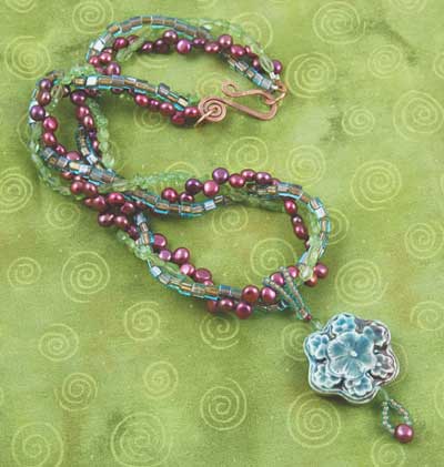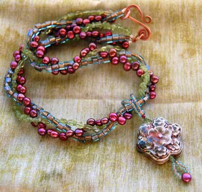 My “Woodland Fairy” bracelet was inspired by a stitch technique in the marvelous book, “Mastering Beadwork” by Carol Huber Cypher. Carol calls the technique “peyote-carry-one” and it is similar to a Dutch spiral in that you add an extra bead which is then not woven into on the next round. It gives more fluidity and drape than regular tubular peyote which can be pretty stiff. It also enables you to add a bead with small holes since you don’t stitch into it on the next round. I decided to use the drop beads I used in my “Woodland Fairy” necklace but I didn’t want to carry them through the whole bracelet. I think it gives the look of a textured bead in front.
