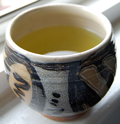The aroma reminds me of freshly cut grass and the spring green liquor is richly vegetal with a tang which wakes up my tongue. The tea packet is created with beautifully textured and colored Japanese paper. I believe that the bottom symbol is the Japanese character for tea. If the spirit ever moved me to get a tattoo, this is what I would choose. I love Japanese kanji characters for their artful quality but especially for how they tell a story about a word or phrase.