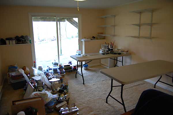 I purchased 2 six foot tables at Lowe’s this past weekend. Everything needed to shift over to the other side of the space to make room for them and the shelves I installed. I actually had these shelves in my bedroom in my apartment and that’s where I stored all of my art supplies. I slept surrounded by all of my beads and polymer clay and tools. Good energy but very crowded!
