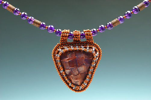 I’m experimenting with weaving seed beads around polymer clay components. I especially like the freeform designs of mokume gane to go with freeform beadwork. My most successful color combinations have been when I’ve incorporated light, medium and dark colors. It’s fun looking around the house for various tools and objects to impress into the clay stack. Just mix your colors, create individual sheets, layer them to make a stack and then texture with your found objects. Using a tissue blade, slice from the top of the stack to reveal the patterns. I love watching the patterns emerge. You can make a “fabric” by laying the slices on a coordinating color sheet of clay. I like to take that sheet and run it through the pasta machine to stretch out the patterns so they swirl and dance around.