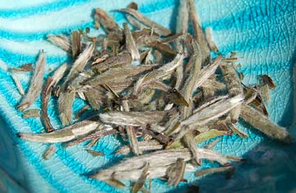 This morning’s tea is a Chinese white tea called Fuding Silver Needles. The name Fuding is for the coastal city on the East Sea in China. As you can see in the photo above, the name fits the tea perfectly. Grown in Fujian province, this tea is described as representing a cultural art form where each leaf is hand processed and carefully rolled so as to keep it intact.