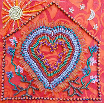 There are some who move often and are able to do so with ease. I am not one of those people. After moving 8 times (5 states) as a child and teenager, loss became a part of my life as I connected and let go many times. So, there are issues there. As an adult, I did settle down and live 18 years in one house where I had my family and raised my kids. A divorce 4 years ago brought about a period of traumatic changes and another move for me and a lot of those issues returned. So, as I beaded this page, I concentrated on all the wonderful things I was gaining and welcoming into my life with this new move – living with someone I love, creating space for a garden and studio, bringing more creativity and color into my life, a space to welcome family and friends for tea and conversation. I read somewhere that the challenging times and losses in your life carve out crevices in your heart that leave plenty of room to be filled with love and positive joyful things. I had contemplated on whether I wanted to fill in the space in the middle of the heart in my piece. I decided to leave it open to symbolize my own crevice that is now welcoming and filling up with all of the joyful moments of my life.
