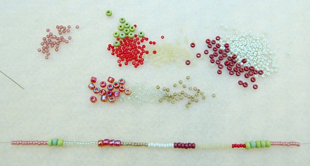 I chose 9 different beads in various sizes – 11s, 8s and 6s – and strung about 10-15 beads of each color for a total of 6 inches. I used 2 of the beads twice in my strand for a total of 11 sections. I always string an even number of beads on a neutral color Silamide thread. Silamide is a twisted 2-ply prewaxed thread that has been used by dressmakers for years. Here’s some great information about it. I’ve been using this thread for years now and I really like it. I used to always use Nymo but it tangled too much on me even when I waxed it. I think that the best thread to use is whatever you feel comfortable with and works well for you. Before I added all of my beads, I added one bead, leaving a 6 inch tail, and looped the thread around to go through that bead again. This creates what is called a “stop” bead which prevents the beads from falling off your thread.