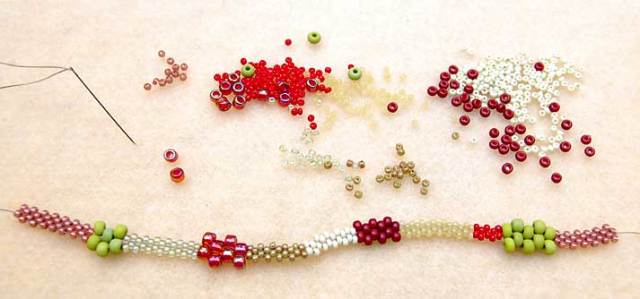 From now on I will start adding beads so that the bracelet doesn’t look so striped. I do this by drifting the colors into each other. In my next installment, I’ll show how I do this.