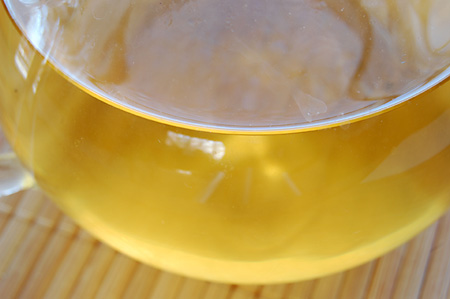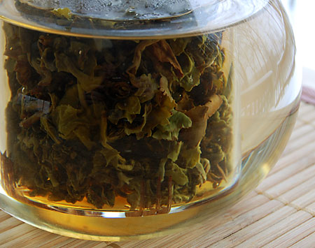A warm spicy aroma greets me as I gently lift the lid of my glass teapot after a 4 minute steep in boiling point (212 degrees F) water. Where the steeping guidelines call for 1 teaspoon per cup, I find that too strongly spicy for my taste so I use 1/2 that amount of leaves.