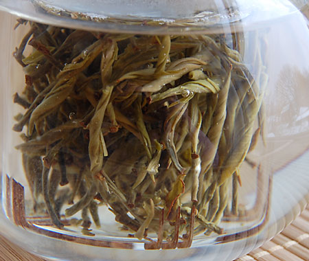 The aroma of the ecru tea liquor is soft and fresh, very reminiscent of a white tea. The tea settles in my mouth with a silky feeling and then releases faint flavor notes of tobacco that linger in the aftertaste.