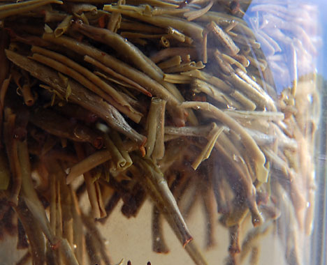 A gentle 3 minute steep in 180 degree F water reveals small pointed leaves that have curled into tiny swords.
