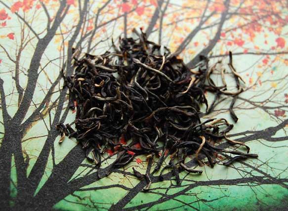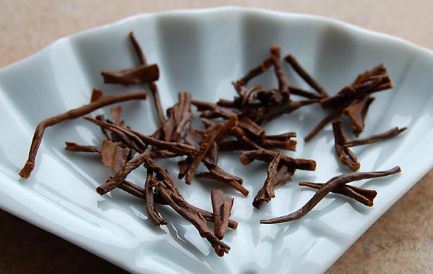 I steeped the leaves for 3 minutes in 180 degree F water. The pale golden liquor gives off a distinctly sweet aroma.