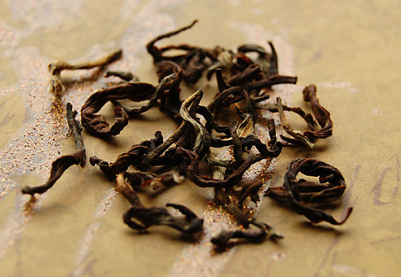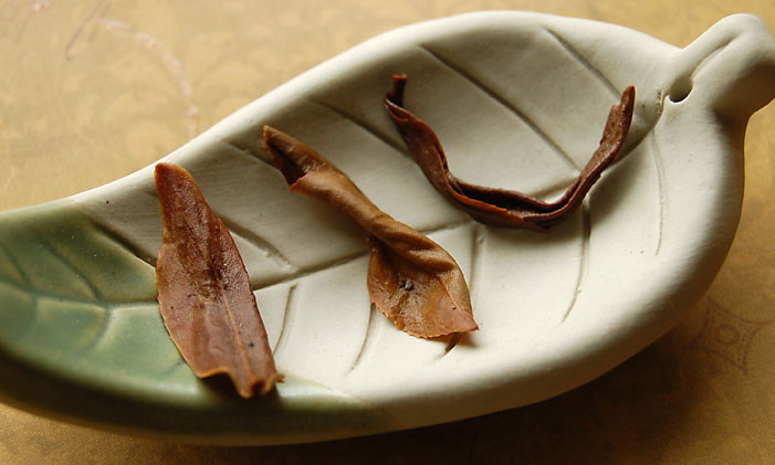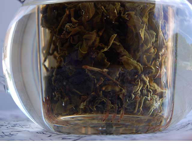 Not quite as dark as last week’s Buddha’s Palm, this tea is the closest in color and flavor to the first Oolong I reviewed 3 weeks ago called Golden Guan Yin. The dry leaf has been curled during processing, opening up during steeping to reveal the large leaves.