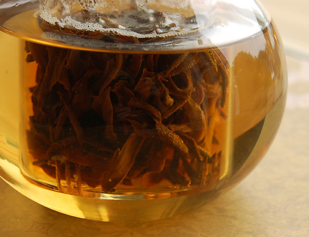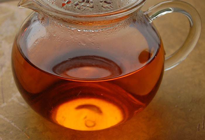 The beautiful light amber colored tea glows in my glass teapot, inviting me to pour my first cup.
