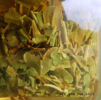 And this tea is positively bursting with flavor! Notes of nut (almond), tropical fruit and citrus pungency sweep across my palate as I slowly savor each sip from my teacup.