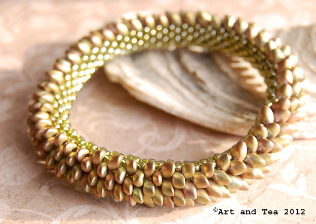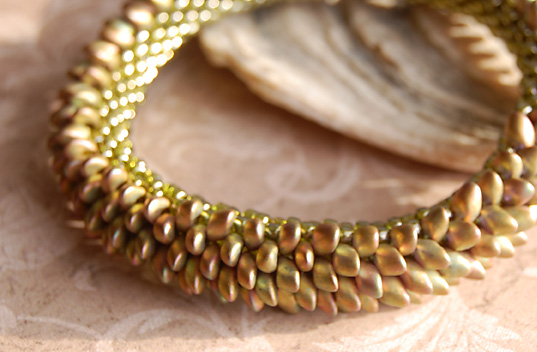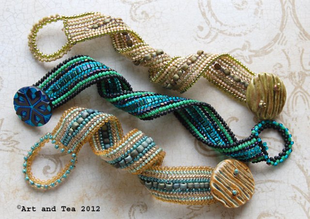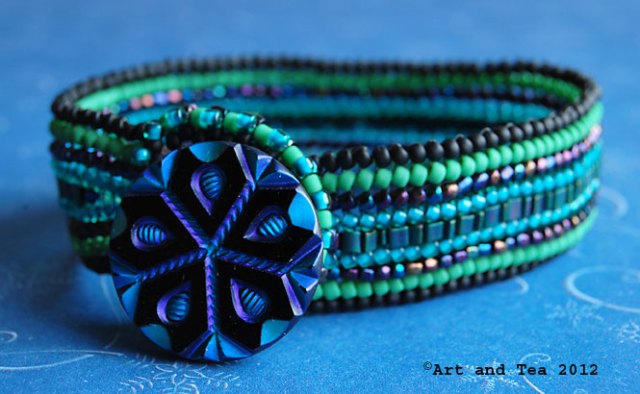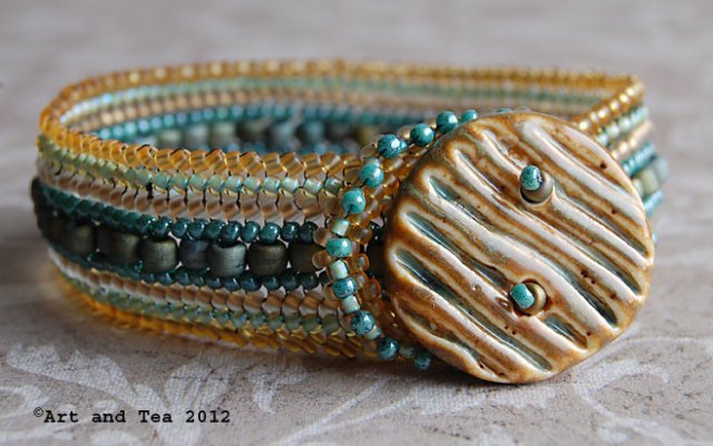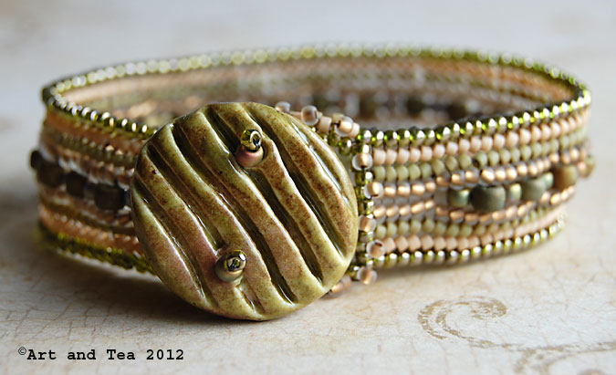 I beaded a bezel around the lentil bead using size 11 and 15 seed beads. The “strap” is brick stitch. I puzzled over what to do for the clasp for several weeks. One evening I happened to pick up my copy of Kate McKinnon’s “The Jewelry Architect” and there it was. Kate calls it the “Ram’s Horn Clasp”. It is positively brilliant! Thank you for your inspiration, Kate. I tweaked mine a bit from the original design. The spiral is a universal symbol found in nature and art and I have always been fascinated with its non-linear shape. Perhaps it also speaks of the abstractness of time?