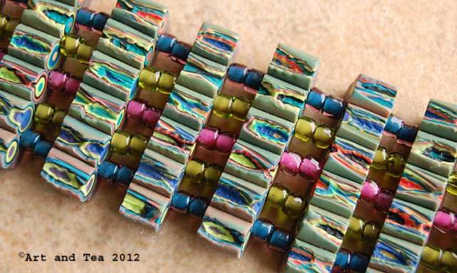 The “face” is a polymer clay lentil bead with a crushed ikat cane pattern. I believe that Donna Kato is the originator of this cane. I learned how to create this cane from a demo at one of my polymer clay guild meetings. If you’re interested in seeing how it’s created, I found this tutorial by Mia Rox.