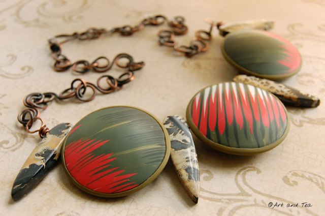 That experience inspired me to create this necklace, which I have named “Albuquerque Sky”. I made the polymer clay focal with my favorite mokume gane layering, this particular one being Barbara McGuire’s Shimmering Gold technique using gold leaf, translucent clay and alcohol inks. Even the name is perfect. Yummy.