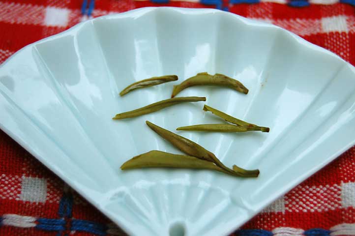 This morning’s tea, called Fujian Green Needle, is a beautifully handcrafted green tea from China. The leaf is a fine plucking of the upper two leaves and bud, processed in an artful way so that the two leaves envelop the inner downy bud. The leaves look like tiny peapods to me.