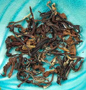 The dry leaves are a rich brown color and, after steeping, give off a rich, fruity fragrance.