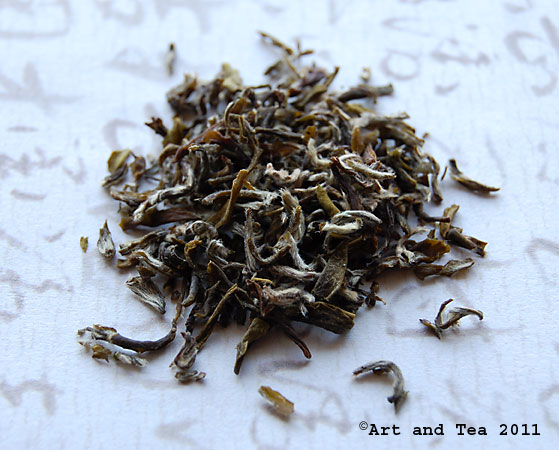 I’ve read that creating the distinctive curly shape of Pi Lo Chun leaf requires five hand motions, a combination of a gentle twist and roll that’s repeated three times. This is done while the leaves are fired in short, round metal cylinders, heated from below. The goal of the “tea firer” is to fix the leaf in its unique curly shape during firing in such a way that this shape will relax during steeping and the leaf will return to its original shape after steeping. In looking at the two photos above, you can see that goal was definitely accomplished. You can see the leaves relaxing during steeping here.