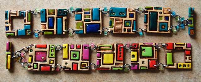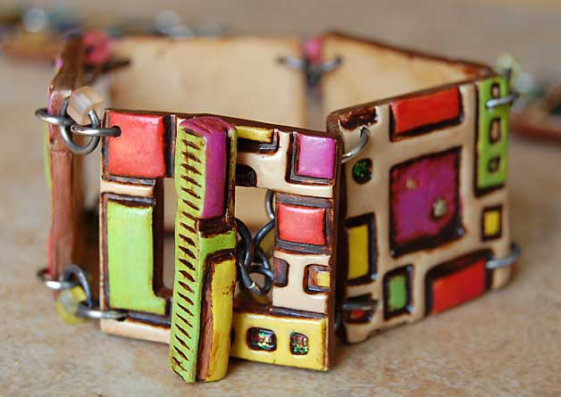 An unexpected and delightful surprise occurred when I cut the tall thin rectangles for my bracelet components. I discovered that there were small gaps where the snakes abutted on the clay backing, perfect for stringing a cord through. To finish the bracelet, I did a little beadwork over the silver crimps and attached a multi-strand tube clasp. The silver clasp was so bright that I immersed it in liver of sulfur to darken it. It’s still not dark enough for my taste so I’ll repeat that again very soon.